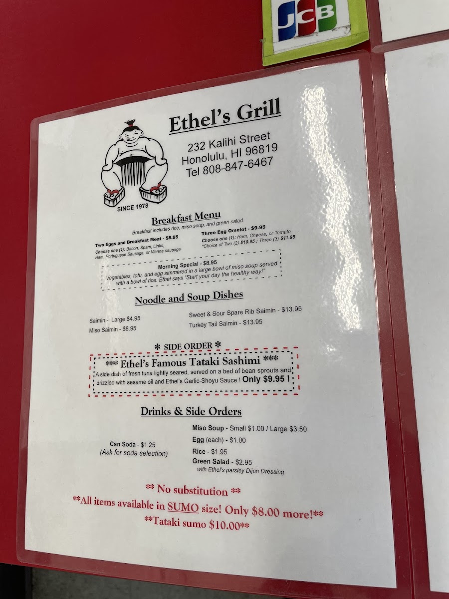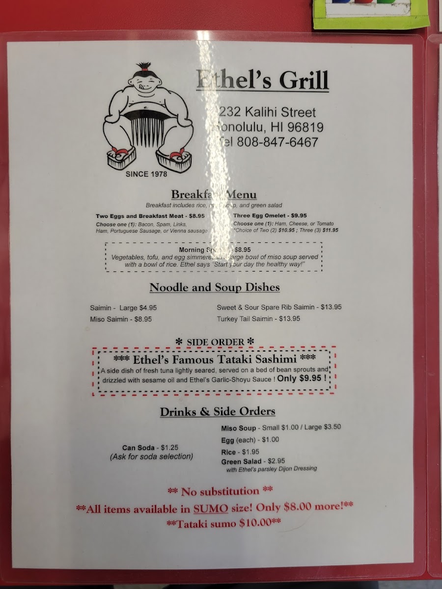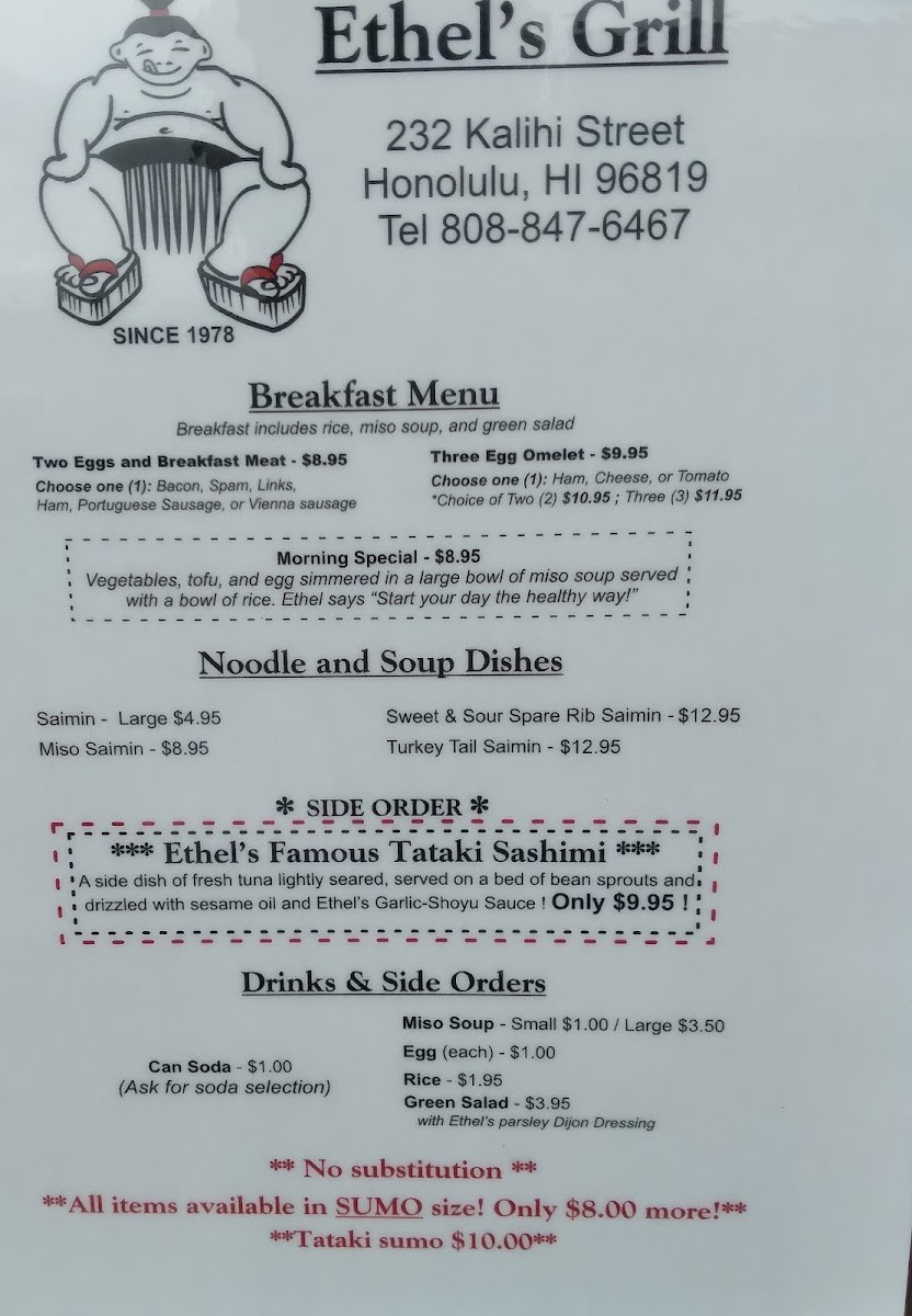 Welcome to Ethel's Grill, a beloved gem nestled in the heart of Honolulu at 232 Kalihi St. This charming "mom and pop" establishment serves up a comforting array of dishes that reflect the heart and soul of local cuisine.